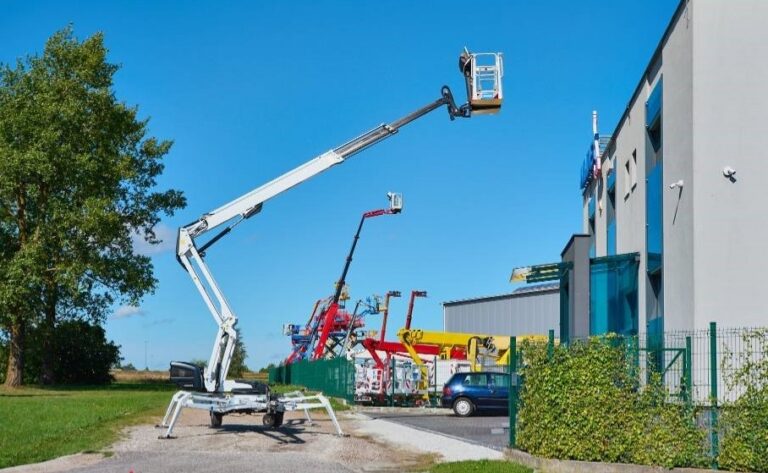 Eine Arbeitsbühne wird bei der PV-Reinigung als mobile Plattform eingesetzt, um Reinigungskräften einen sicheren und stabilen Zugang zu Solarmodulen in der Höhe zu ermöglichen.