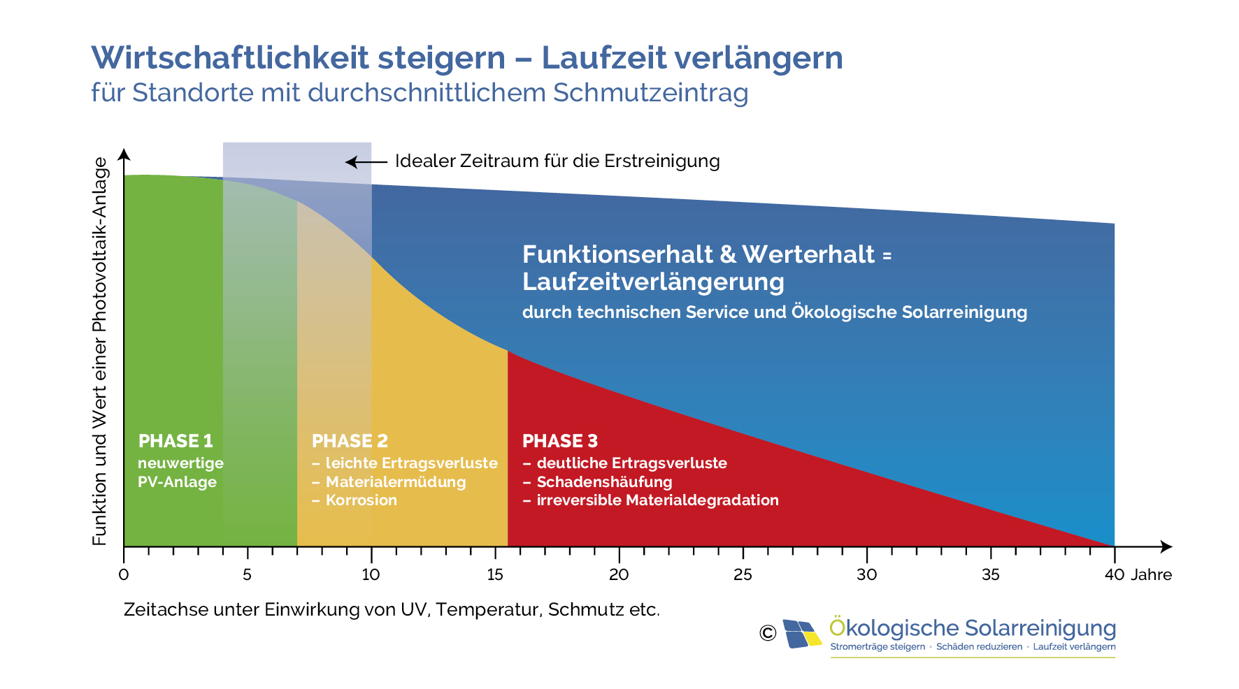 Schmutz wie Pollen, Staub, Vogelkot oder landwirtschaftlicher Stallstaub kann die Stromproduktion um bis zu 30 % mindern. Eine saubere Anlage erzielt wieder ihre volle Leistung.